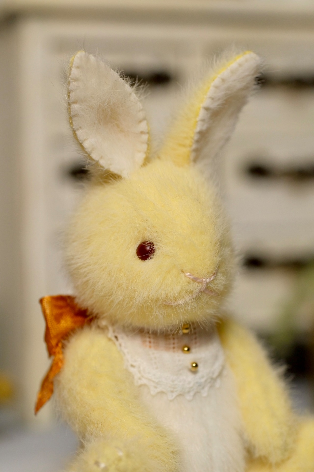 オリジナルの型紙を用いて手縫いで作成したうさぎのテディアニマルです。
